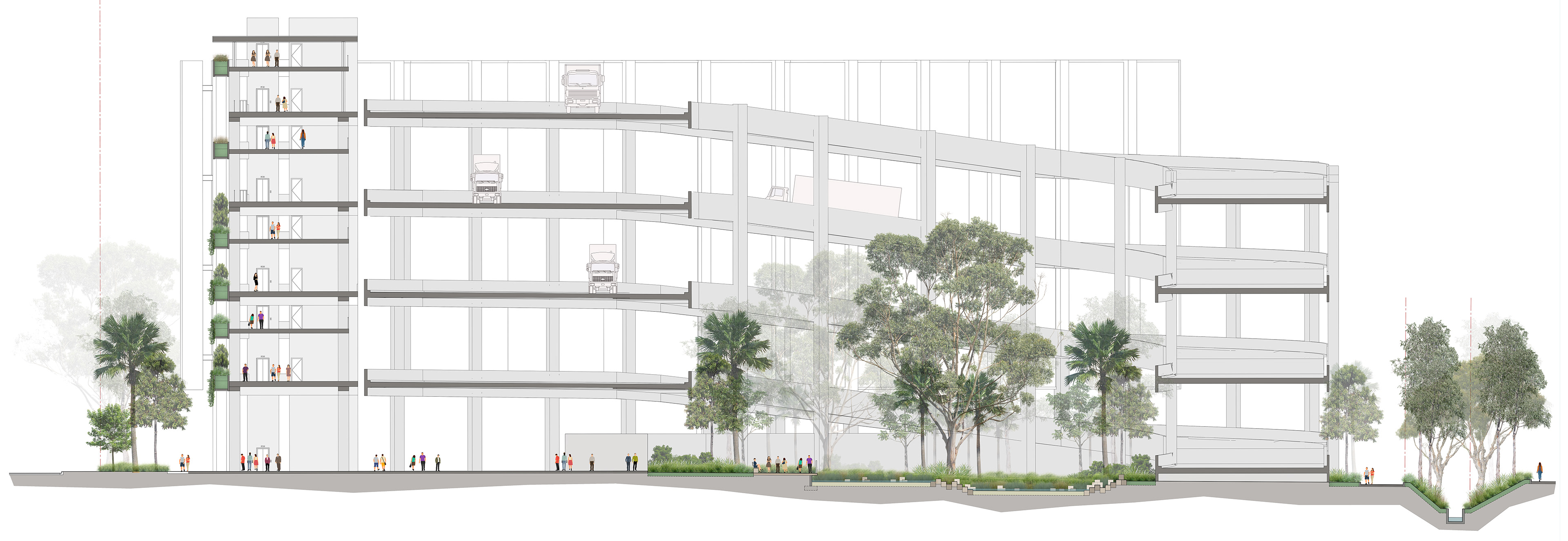 Generous public entry plazas address the street frontages and activate the public domain. Planting within the front setback and public domain will extend up the building within the significant planted terraces of the northern façade. These planted terraces will contribute to the greening of the streetscape and the builtform when viewed from the surrounding urban area and public domain.