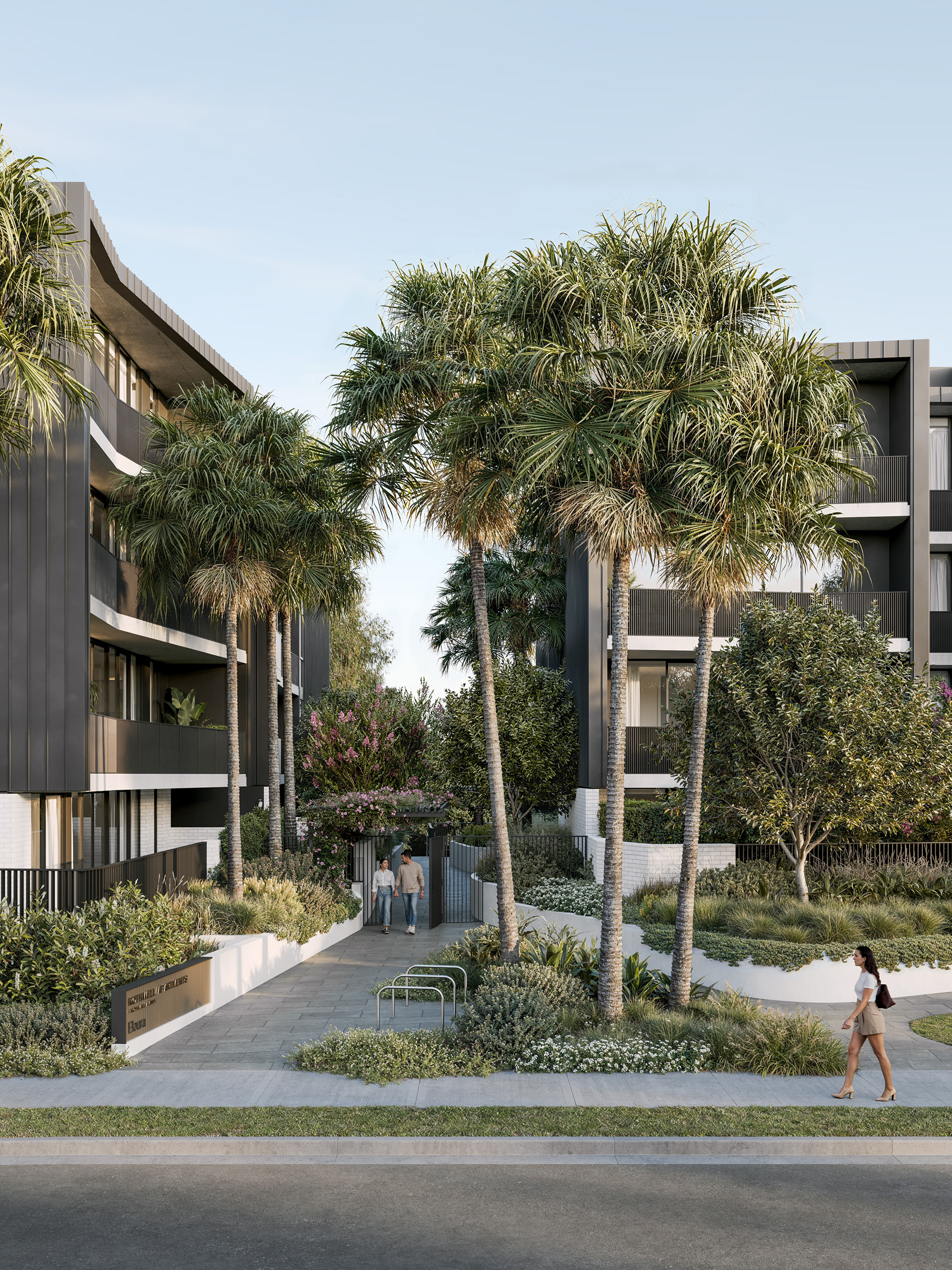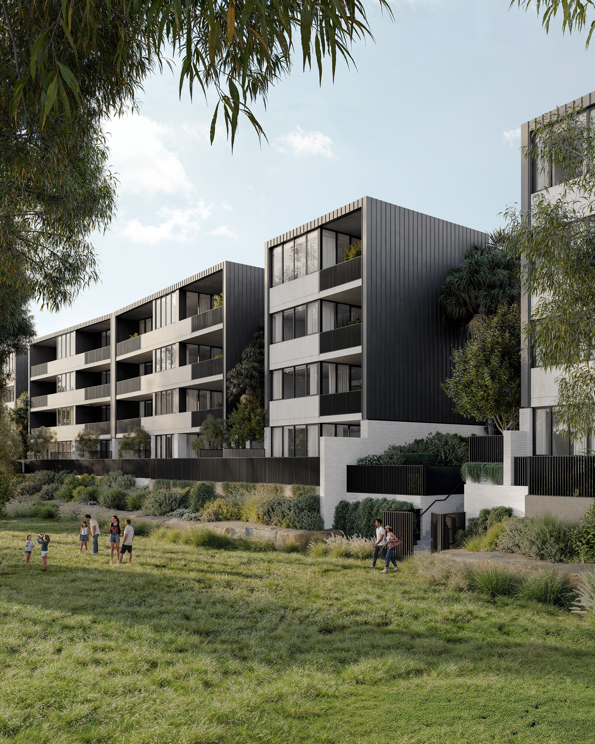Conceived as apartments within a ‘park’, the built form of the Rothwell Avenue Apartments has been articulated and setback from Rothwell Avenue allowing for a generous vegetated frontage to the streetscape that improves connections to the adjacent natural open space areas.